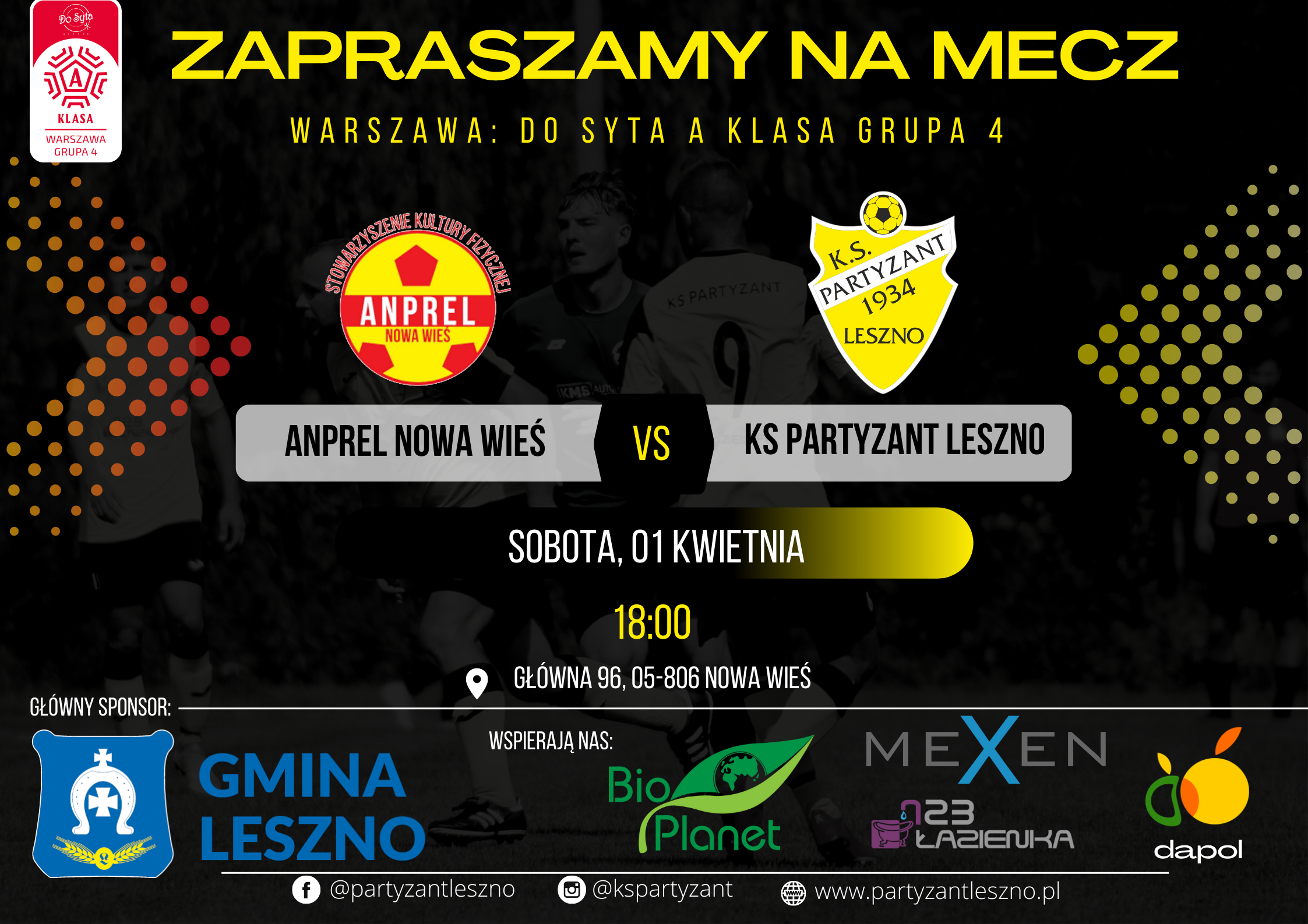 𝐀𝐧𝐩𝐫𝐞𝐥 𝐍𝐨𝐰𝐚 𝐖𝐢𝐞𝐬́ vs 𝐏𝐚𝐫𝐭𝐲𝐳𝐚𝐧𝐭 𝐋𝐞𝐬𝐳𝐧𝐨Warszawska Do SYTA A KLASA 4grupa 01.04.2023r godz. 18:00Boisko w Nowej Wsiul. Główna 96 Już w sobotę 1 kwietnia o godzinie 18:00 spotkają się ze