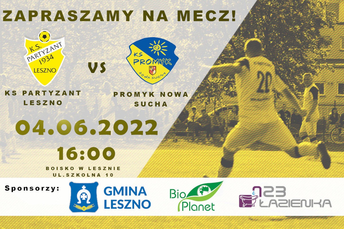 Partyzant Leszno vs. Promyk Nowa Sucha 04.06.2022r. godz. 16:00 ul. Szkolna 10, Leszno Już w najbliższą sobotę do Leszna przyjeżdża drużyna Promyk Nowa Sucha. Promyk znajduje się na piątym miejscu